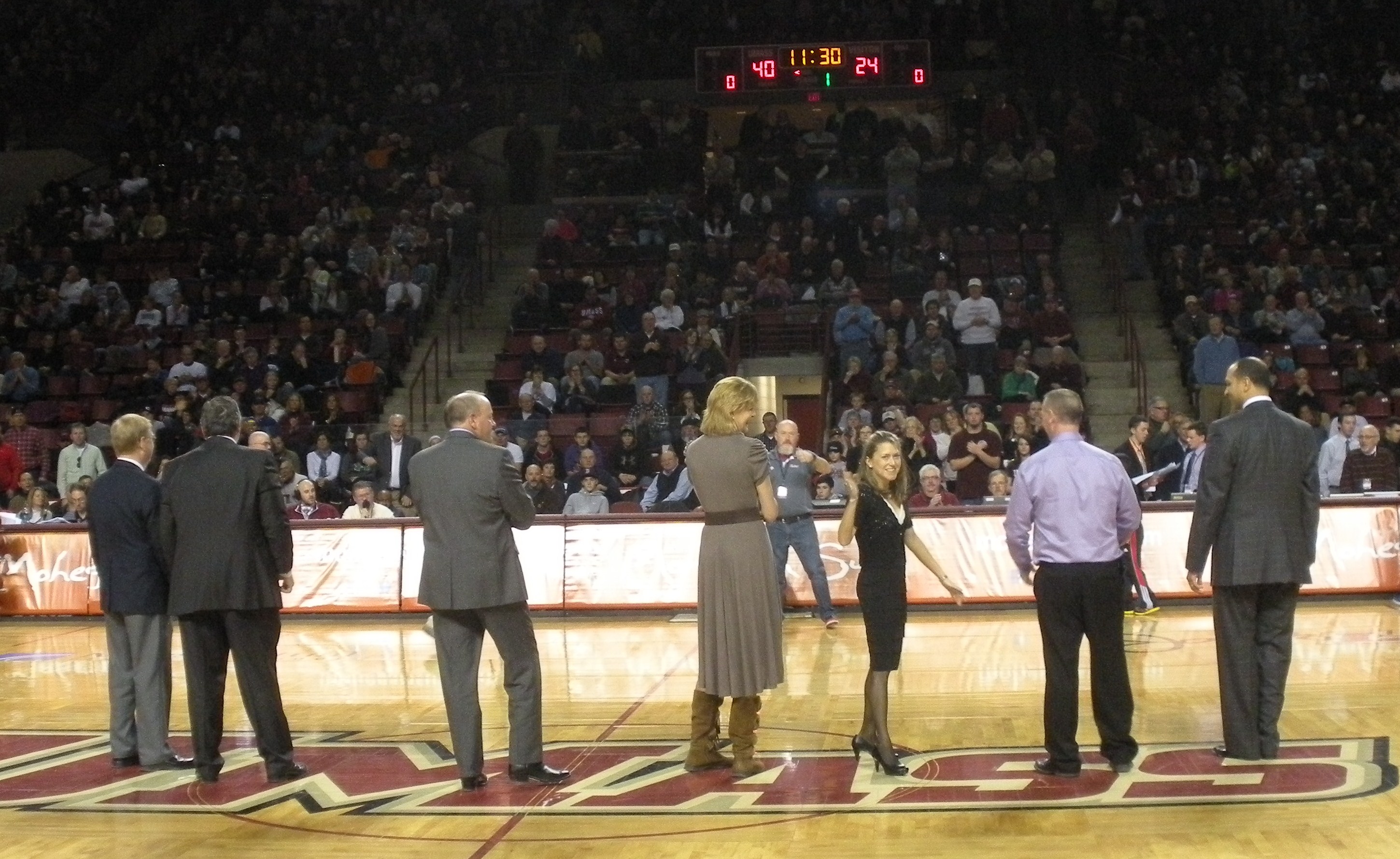 I was notified of the honor in October so I’ve been counting down the days and waiting in anticipation since then. The whole day Sunday was pretty incredible. It started with a men’s basketball pre-game reception in The Massachusetts Room at the Mullins Center. The walls were covered with beautiful plaques of all the hall of fame members throughout UMass history. I was really taken by the older plaques which were done by a commissioned artist whose work was beautiful. If UMass ever decides to go back to the old format I would love to get in line for that job! At the reception we met the other five inductees for this class and a lot of the alumni club members that were there to watch the game. We also finally met Jason Germain. Jason organized the event and has been in touch with all of the inductees, via phone and other social media, about preparing for the event since October, thanks Jason! After all of that, we went down to our seats for the game against Fordham. We had floor seats which was super cool to be so up close to the players and all the action. At half time they called us out to the court to be recognized. I have to be honest that it was hard not to feel a tiny bit like a rock star at that moment. UMass dominated Fordham and showed they are a top 25 team. What a game!