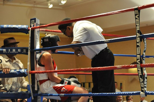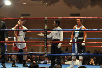 The ref put us through the pre-fight routine (the particulars of which I cannot recall), held out her arms like a ballerina, and gave us the signal to box.