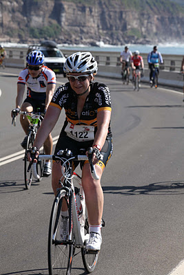 Nicola on Sea Cliff Bridge Nicola explains her “typical training week consists of four early morning rides usually Saturday (about 40 km), Sunday (about 60 km), Tuesday (25 km) and Thursday (25 km). I’ve increased it a bit at the moment because I’m training for a 160 km ride in six weeks time.”