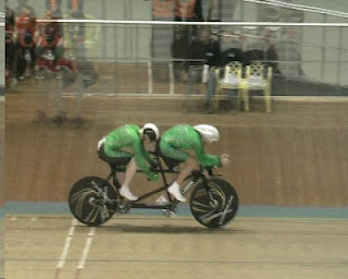 The morning of the 3km pursuit we eat a light breakfast, preload race fuel, and then head to the track to warm-up. The turbo warm-up is a very specifically planned 70 minutes to deliver us to the bike which is set and locked in the starting gate on the track. Three minutes from the off we sit side by side on the holding chairs waiting of the call to mount the bike.