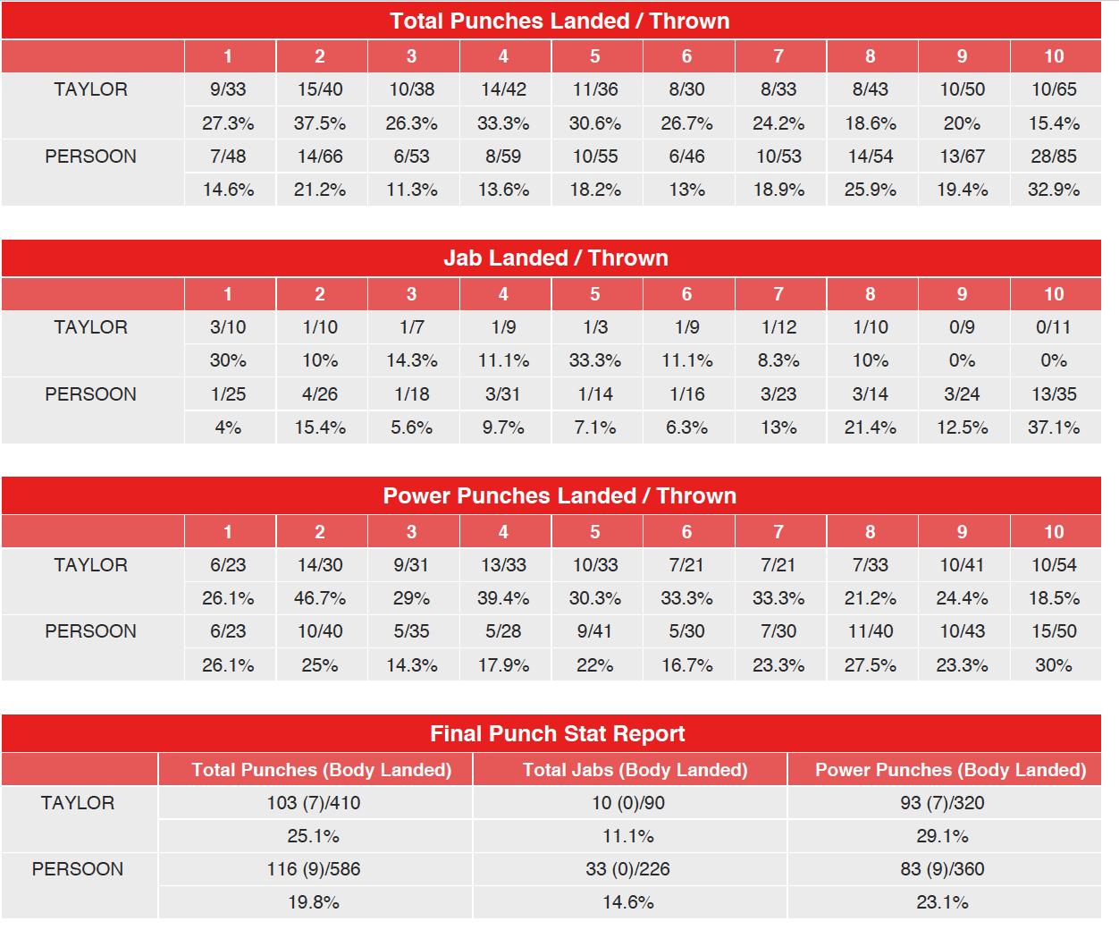 But, but for me Taylor’s punches were cleaner and more accurate overall - a lot of Persoon’s blows from the later rounds were fast and furious but not getting past the defence. (Updated to add - watch her right hook especially for this). See the Compubox stats below. She just didn’t take the win in the way that so many fans have grown to expect.