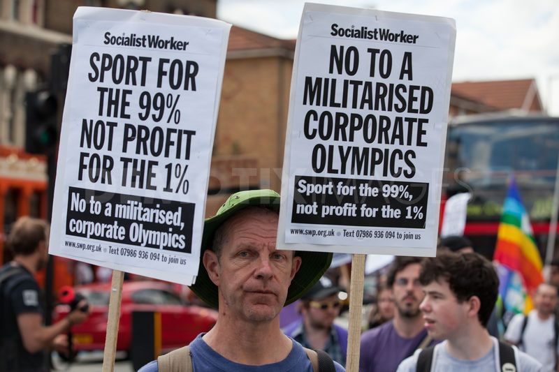A man holds placards protesting against the corporate sponsorship of and militarisation of the London 2012 Olympics. (Demotix.com)