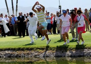 Yani Tseng takes the traditional plunge on the 18th at the Kraft Nabisco (Stephen Dunn/Getty)