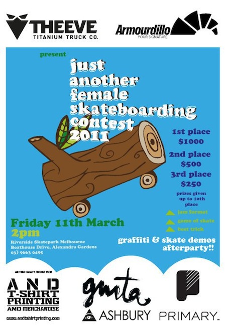Great to see that Theeve Trucks and Armourdillo are hosting another girls skate comp in Australia at Riverside skatepark (Melbourne) on 11th March. There’s some nice money up for grabs for a jam format contest, a game of skate and best trick prize. On t...more