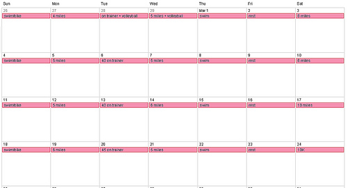 Wow, putting together a training plan that covers a 10 mile race in April, a sprint tri in May and an Olympic tri in June that still leaves time for things like my volleyball and softball leagues is much, much harder than I expected. In fact, it took me ...more