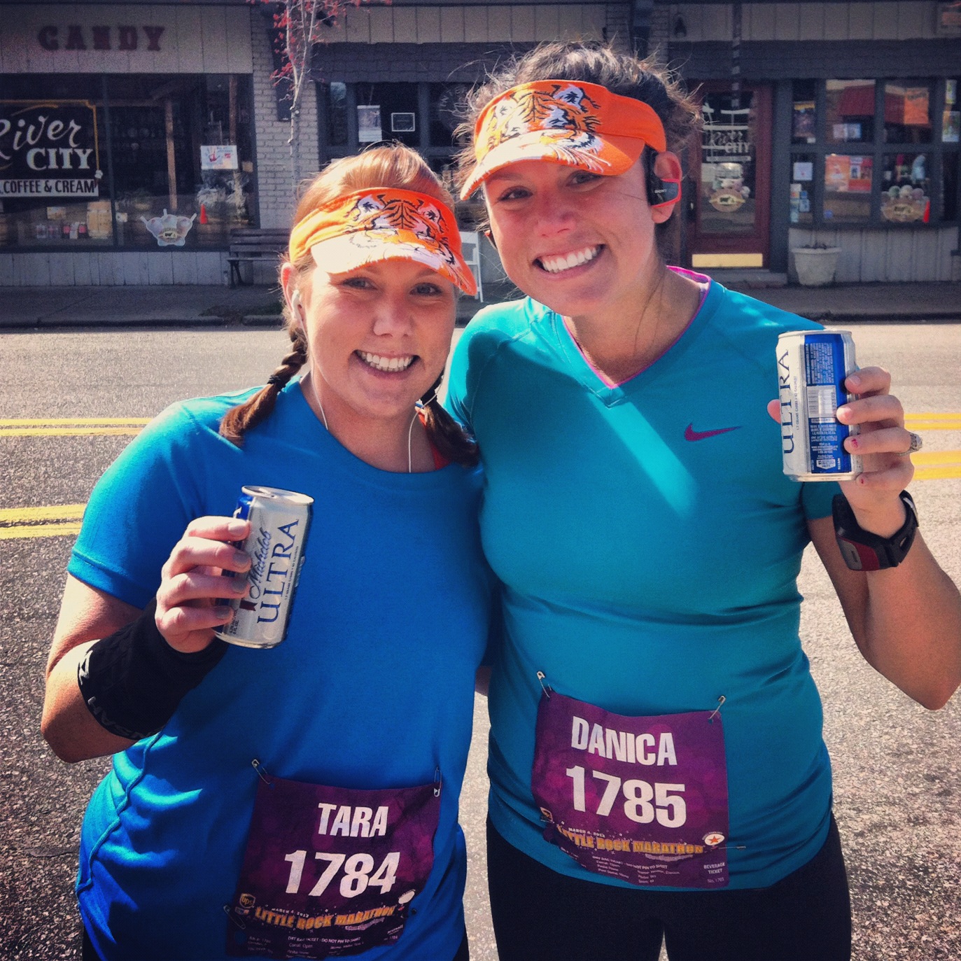 Tara and I ran the whole race together. It was really a nice start, we headed out to the Clinton Library and around the downtown area and over the river on a bridge. It was really a nice day. One thing I noticed, and it might be my job critique coming out in me was that there was throwaway clothes ALL THROUGHOUT THE ENTIRE COURSE. Like everywhere, I haven’t ever seen so many throwaways at mile 6. It didn’t make sense to me. But that was interesting and I know it must stink for them cleaning that all up. We checked off the miles, drank our water every mile and at mile 6, I ate my first sandwich square. There were so many people out along the course, so much spectator participation, which I loved. I love it when people take part in the race and make it special for the runners and the Little Rock community really made a huge impact along the course. There were so many stations out there that communities had set up their on their own with a huge array of snacks, drinks, and just people out cheering and enjoying the race. I will never forget how many people were out there and EXCITED to be out there. That made a huge difference.