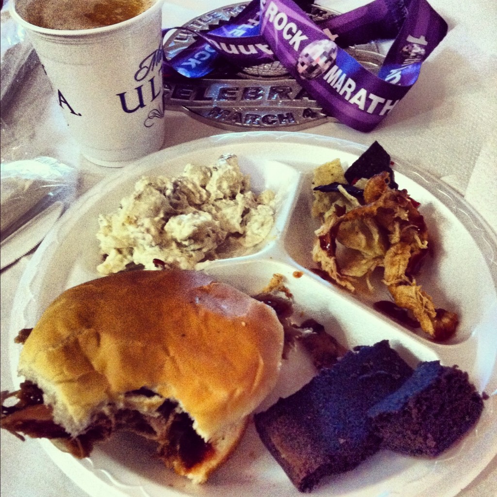 AND the best part of Arkansas Marathon is pretty much the POST RACE PARTY! Boom! Awesome way to end the day with all you can eat BBQ! We showered up and arrived nice and early. Hit up the free bar, ate enough BBQ to fulfill our empty stomachs… and enjoyed the band.