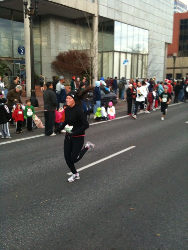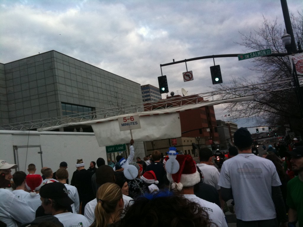 This past Sunday, I got the opportunity to run my first race out of state at the Portland Jingle Bell 5k! It was a very well organized small race that was an out and back along the water front in Portland. I wore a long sleeve Nike shirt underneath my jacket and long Lucy pants. I was really nervous that I would be too cold, but I wasn’t at all! I also wore my Monkey Beanie to the start line, but traded it in for my North Face headband/ear warmers for the run as the beanie would have gotten too hot. I also made sure to wear my Adidas running gloves because I didn’t want my fingers to get too cold.