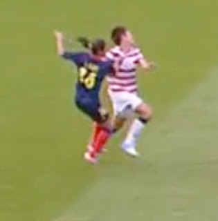 A few minutes later Rapinoe was flying up the wing with the ball. Lady Andrade struggled to get ahead of Wambach, who was racing up the middle. Incredibly, Andrade reached around Wambach with a hook to the face. Deliberate foul.
