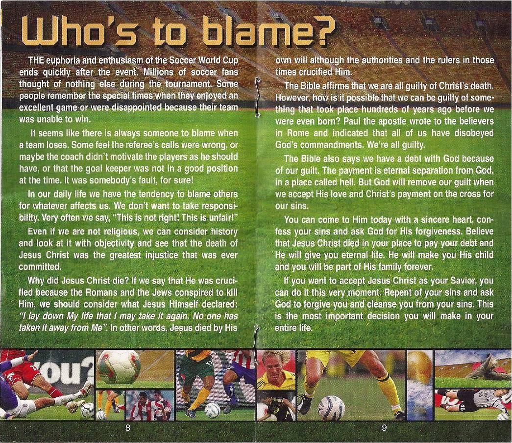My favorite World Cup ephemera is this brochure, produced for a "Bible Correspondence Course" in Long Beach, CA. A friend of mine found it on his car windshield, a couple weeks before the tournament's start.