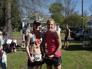 Saturday I planned to run my standard 6 miles at goal half marathon pace. Typically this is usually a shock for the legs after the marathon. To change things up, I ran the local Historic Starkvegas “10K” (it’s a very hilly and long course, 6.43 miler to be exact). I ran a great tempo and awesome splits, averaging 5:57 (sub-80 pace) on the hardest 10K course I have ever run. It’s a rather new race…a nice scenic course that needs to be measured or certified (obviously). But it was incredibly organized in its second year- if they end up getting it re-measured for next year, I may do it again. Great hill training! Oh yeah, I did win, my friend Kelly was second. I felt fantastic!