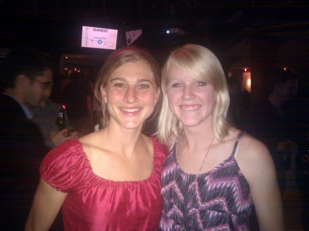 Hanging out with Megan and lots of really great people at the pre-race Runner's World Party. Must say that was the best-dressed group of people who work in the running industry I've ever seen. And here I am in the same red dress from the hanging pizza NYRR function the night before. Nice.