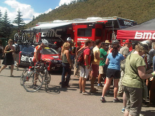 It was obvious who the contenders were.The top guys had a team car following them and the really top guys had a motorcycle with a cameraman hanging off the back as well. I am not sure what the poor saps without a team car were supposed to do if they flatted. Walk to the top of Vail pass with their bike slung over their shoulder? What a bummer that would be.