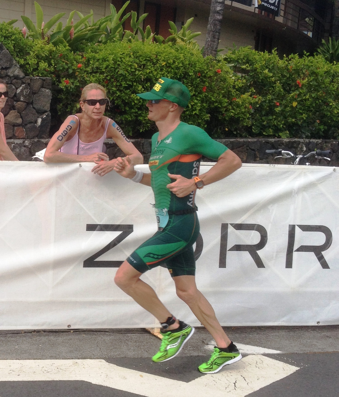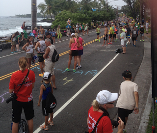 We stood along Alii Drive waiting for the athletes to come through. Among both the pros and the age groupers, the pattern was similar, some people looked so smooth and happy while others wore the pain of the day on their faces. Some people ran tall, other were stooped over. It was easy to pick out whose quads were trashed, whose hamstrings were cramping, and who managed their ride well enough to run with relative ease.
