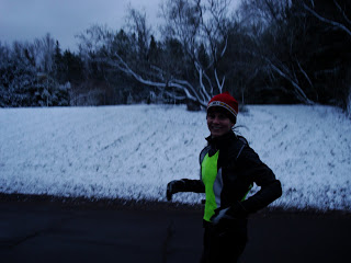 Because it has been so warm, the roads were a bit wet this week, and the snow today meant that the temperatures (obviously) dipped below freezing. This meant that the roads were covered in a sheet of ice. Not too bad if you can run on the non-roadways (eg. snowmobile paths), but since we started at 430 and it gets dark by 5, well... you can imagine. We were slipping and sliding (to the tune of Little Richard) and were extra cautious on the downward slopes. There are a lot of downward slopes in Houghton. The snowmobile trail was a beacon, and the ground crunched under our feet. I guess its time to buy new trail running shoes...