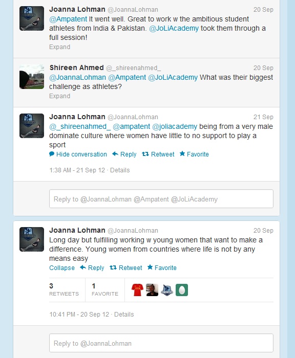 Most importantly was the opportunity for the women to train with and engage in healthy activity with women from their neighbouring country. It is commonly known that India and Pakistan have many socio-cultural, political and religious divides. The differences between the nuclear-armed countries in opinions of history, geo-politics made it almost impossible to get a visa for many years. Athletes were not able to compete against each other in regional competitions thus greatly reducing the prospects for proper local competition. Only recently have both nations signed an agreement to warm relations and facilitate border crossing.To connect these talented women abroad in this manner is critical to continue to bridge building and develop understanding for the future. Each delegate was an ambassador to their country. Most importantly to accord these athletes such an experience to empower themselves and provide opportunity for personal growth is outstanding. These athletes come from countries where there is not yet support for women's football, either financially or culturally and they can be met with resistance. To engage in an exchange to improve their skill, drive and be enjoyable is a fantastic venture.As the focus of this trip was football the young women attended a professional women's soccer match with DC United Women's team and worked with JoLi Academy for advanced technical training. They were trained with accomplished players such as Joanna Lohmann (DC United Women and also a Co-founder of the JoLi Academy). Lohmann took to twitter to praise the efforts of the young delegates and respectfully note their challenges.
