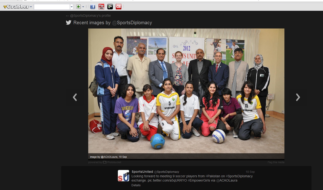 The United States State Department has an Sports Exchange program called "Sports United" under the umbrella of the Bureau of Educational and Cultural Affairs. This program hosts athlete delegations from various countries and sends US athletes to other countries to learn about culture and philanthropy through sport. Sports United encompasses fair play principles to build bridges and empower youth.From September 11-22, 2012 it hosted 18 young women and two coaches from India and Pakistan.The ten-day program offered opportunities for the athletes and coaches to speak with sports management and offers conflict-resolution workshops. These young women gained access to young athletes, nutritionists and sports professionals during this exchange. They were provided with a tour of ESPN studios in Washington, DC for a tutorial in Sports Media. They met with State Dept Rep James Moore (Deputy Assistant for Public Diplomacy in the Bureau of South and Central Asia) to discuss their challenges, obstacles and share ideas and provide encouragement for one another.