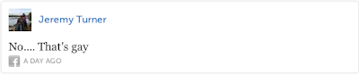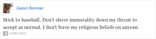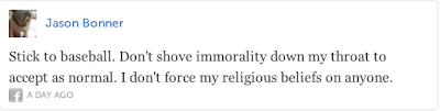 The last tweet, "Why bring gayness into it" is about as naive as they get. Gayness wasn't brought into baseball like one brings a bean salad to a dinner party. Where there have been people, there have been gays. Whether you acknowledge their existence or not is a completely separate issue. And what does it mean when one does "not hate gays, just hate their lifestyle"? If I said, I don't hate black people, I just hate their lifestyle I'm pretty sure I would still be hating black people (which, I don't - FYI). Is not your lifestyle part of your identity? Isn't your identity who you are? Also, in response to Jason Bonner's tweet, I'm glad you do not force your religious beliefs on anyone but supporting the LGBTQ community is not accepting immorality, rather it is an acknowledgement of human rights. Those little rights that enable you to go to church and wear a cross without persecution are the same rights that enable gays to be recognized as equal members of society.