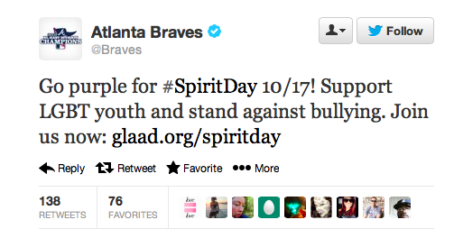 The Atlanta Braves took a bold stance in support of the LGBTQ community this week by supporting GLAAD Spirit Day. The Braves organization also hosts an annual gay night, and produces anti-bullying videos as ways to make amens for their pitching coach's, Roger McDowell, anti-gay slurs. On October 17th the Braves tweeted the following: