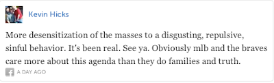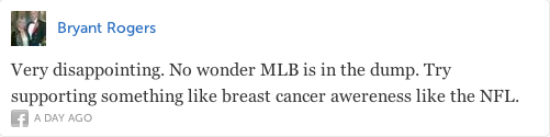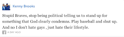 Let's address the notion that the Atlanta Braves should "stick to baseball", as if baseball exists in a vacuum separated from the rest of the world. Let me ask what does Viagra have to do with professional sports? What does NAPA Auto Parts have to do with baseball? Nothing really, but such corporate advertisements have become acceptable as part of one's sporting experience. And no, advertisements in every single stadium sight line are not part of sports history. Social causes have also entered the tangled web of professional sports entertainment as the tweet from Bryant Rogers states "Try supporting something like breast cancer awareness like the NFL", which, by the way, the Braves already have a breast cancer awareness day, a prostate cancer awareness day, and a military outreach day among their various events. Thus, social causes, although not part of the game of baseball, have become acceptable so long as they are causes that the fans deem socially acceptable. It is Ronald Reagan's legacy (a President that most of these Tweeters, I assume, would have supported) that citizens and corporations alike support the social causes that the government no longer feels are its responsibility. Therefore, to rail against the relationship that is 'corporate social responsibility' is to speak out against the conservative manifesto that has created the very system that enables baseball to be a multi-billion dollar business.