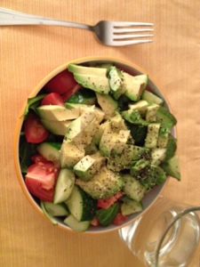 A few days ago, one of my coworkers sent around a few dinner suggestions for all us juicers. Our options were a) drink another juice! (straightforward enough); b) drink a glass of nut milk; or c) make a salad with chopped, raw kale, tomato, cucumber, and avocado, drizzled with a little bit of olive oil and lemon juice. I opted for the latter, and made myself a huge kale salad. Even though the salad only contained veggies (I typically always add at least one grain to my salads to fill me up) I was very full after I finished.