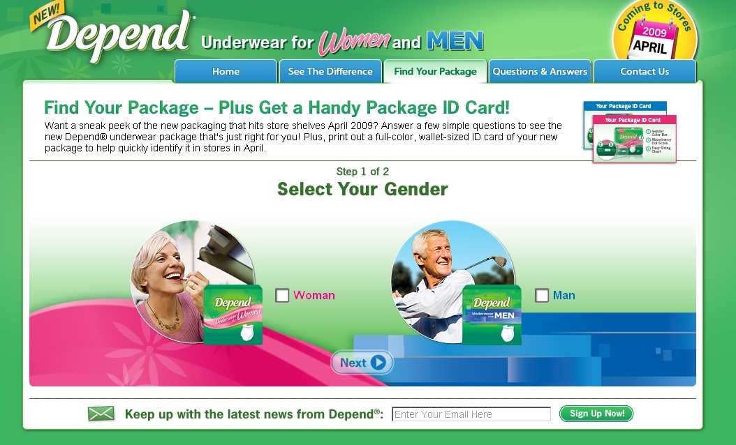 Last night I was watching TV and saw an ad for Depend undergarments that had a “Mars-Venus” ring to it. I thought is was strange, but when I went to their website this morning, the print ad I saw was even more disturbing. I know this isn’t sport related (although the male is playing golf!), but I had to include it. If there was ever a doubt that gender is constructed, this would be an exemplar! I’ve included it here, but I’d encourage you to go visit the website just to get the full effect.