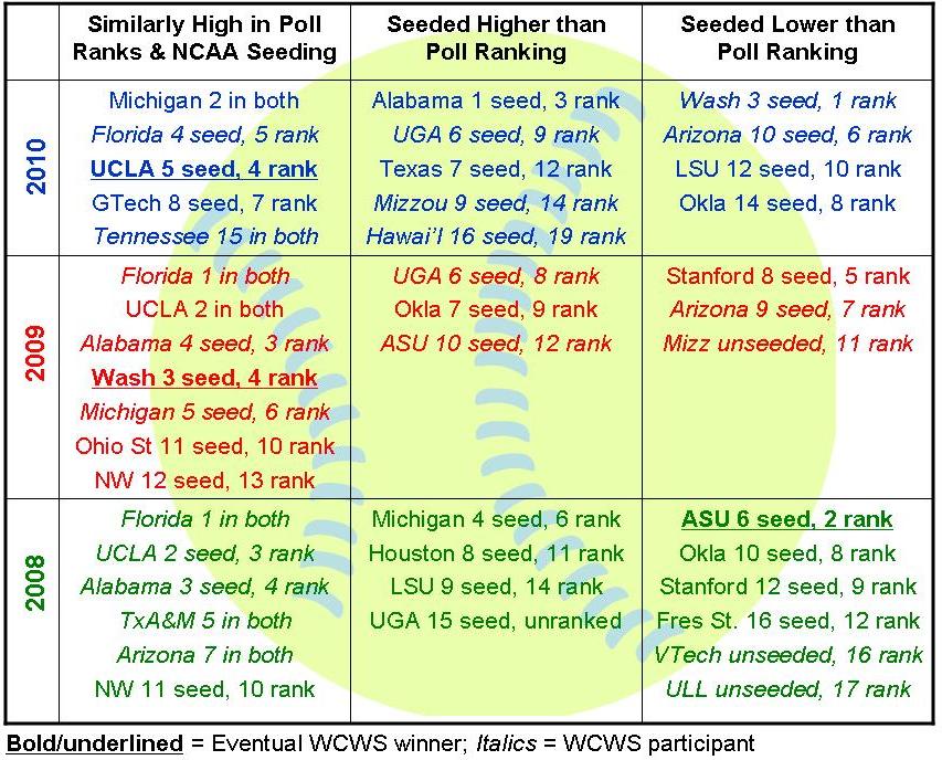 Though we obviously have a small sample, it seems that of the two, poll rankings may be a better indicator of likely tournament success than the seedings. Most notably, the 2008 Arizona State squad that won the Women's College World Series was ranked No. 2 in the poll, but only seeded sixth. That same year, Virginia Tech, which made a surprise appearance in the WCWS, had a poll ranking of 16th (potentially warranting a No. 16 seed), but was unseeded. Louisiana-Lafayette, another surprise 2008 WCWS participant, was ranked 17th, but unseeded.