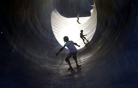 The skaters were judged on the number, variety, difficulty and stylishness of tricks they performed in one-minute heats as they swooped through the park’s mini-bowls and “skull” bowl.
