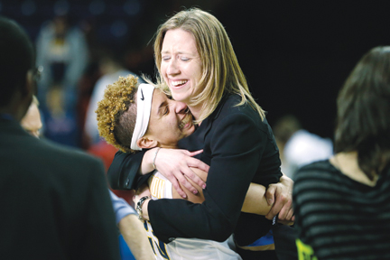Clarendon hugs Coach Gottlieb, pic from San Francisco ExaminerI have this theory--yet to be empirically proven (working on that)--that the make-up of a team is a direct reflection of a coach's philosophy and identity. And if you look at Lindsay Gottlieb's players you see that she believes in an inclusive environment. Can you imagine what Rene Portland would have done with a player with a mohawk like the one sported by senior standout Layshia Clarendon? I can't even imagine Geno Auriemma allowing a player who looks like Clarendon to be a Husky. Gottlieb has recruited almost exclusively from California (the one exception is the player from Israel) and her team looks like few others in DI women's basketball. Long hair, short hair, very little hair, almost no make-up, braids, mohawks. No apologetics here. Even Gottlieb eschews a lot of the unspoken mandates for female coaches. She rarely wears make-up. And yes, she sported some shiny black stiletto sandals last night, but she a quick search of Google images shows that she usually opts for a casual professional look.