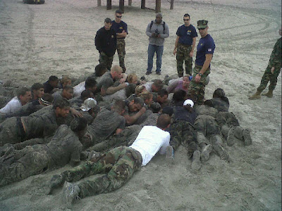 After that though, things got ugly. They got ugly, and wet, and dirty, and miserable. It was about 60 degrees out yesterday, which is still a little chilly when you’re dry. But where is the fun in that? After it was all said and done I think we jumped in the ocean about six times. You had to be wet from head to toe. I tried to dodge this and at first just went shoulder to toe because…you know…my hair, but I quickly got sent back in the ocean. After we emerged from the ocean, we rolled in the sand, bear clawed back to the ocean, then slithered in the sand some more. My fatigues were heavy and wet and falling off me, but it didn’t matter. I was shivering and miserable, but nobody cared. In fact, they kept yelling that in your ear. “Nobody cares that you’re uncomfortable! Who gives a s#it that you’re wet and covered in sand! We could care less about your feelings! How you feel doesn’t matter!” And sooner or later, you got it…sort of. You were going to be totally out of your comfort zone and you had to find a way to be okay with it. How you felt had nothing to do with whether or not you were going to accomplish something and you had to disassociate the two really quick.