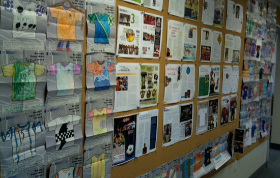The wall of AYSO coloring contest submissions.