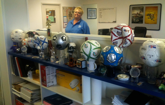 A candid shot of Lynn Berling-Manuel behind a shelf of trophies and balls.