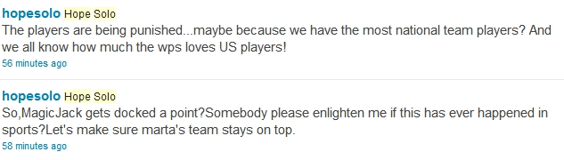 This came on the heels of one of Solo’s more inflammatory harangues. On May 13, 2011, her club magicJack had been docked a point for failing to comply with several of Women’s Professional Soccer’s standards.
