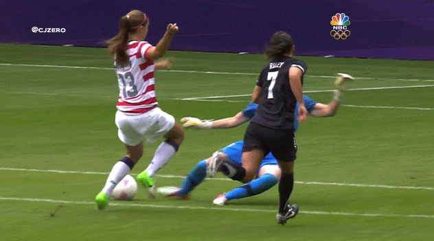 Poor Jenny Bindon. She plays her whole life, and unfortunately now she’ll probably end up best known as the keeper whom Alex Morgan kicked in the head at the 2012 Olympics. The video has spread like wildfire everywhere today after the game, mostly because it involves Morgan, of course. Well, all publicity is good publicity, right Jenny?