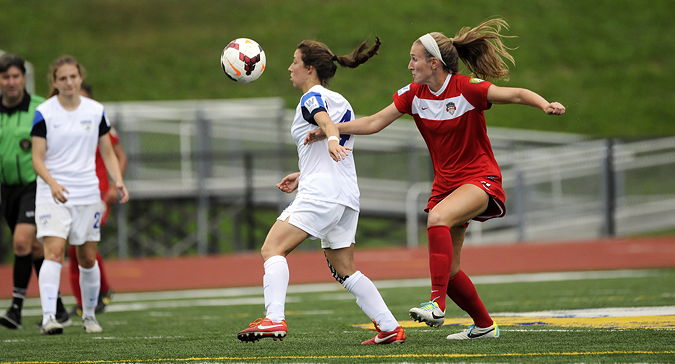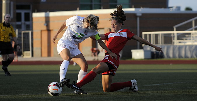 Despite missing their leading goal-scorer at the time, Ashley Herndon, who was with her U-19 team, the Washington attack looked as sharp as it has all season, and it took only 13 minutes to get on the scoreboard, with Kara Wilson taking the ball off the end line and kicking it out to right flank defender Jennifer Skogerboe, who sent a perfectly placed cross to Katie Yensen’s forehead that she just had to redirect into the lower left corner. “Jen played a perfect ball in, hit me right in the head,” said Yensen. “I was able to redirect it to the corner, which is good. It didn’t have a lot of pace on it, but it was accurate. And they left me pretty wide open in the box, which helped.”