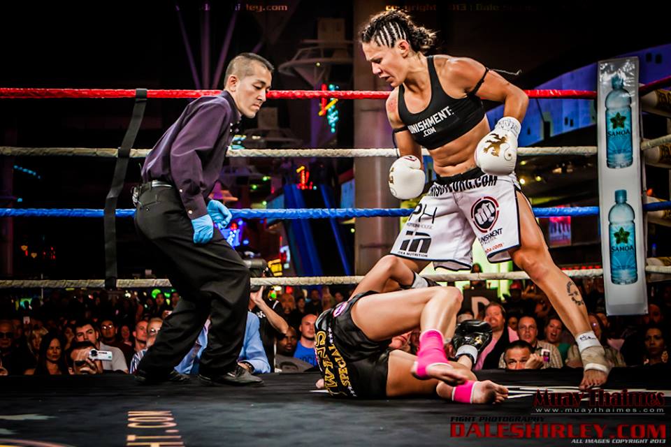 At Lion Fight Promotions Friday, the InvictaFC MMA featherweight champion woman-handled last minute replacement Jennifer Columb (10-1) in a Muay Thai battle, giving the French fighter her first loss as a pro.
