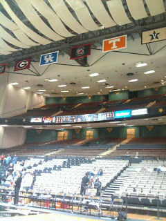 Vanderbilt's arena is almost a square with three levels. SEC conference flags hang on the ceiling, including Tennessee's.