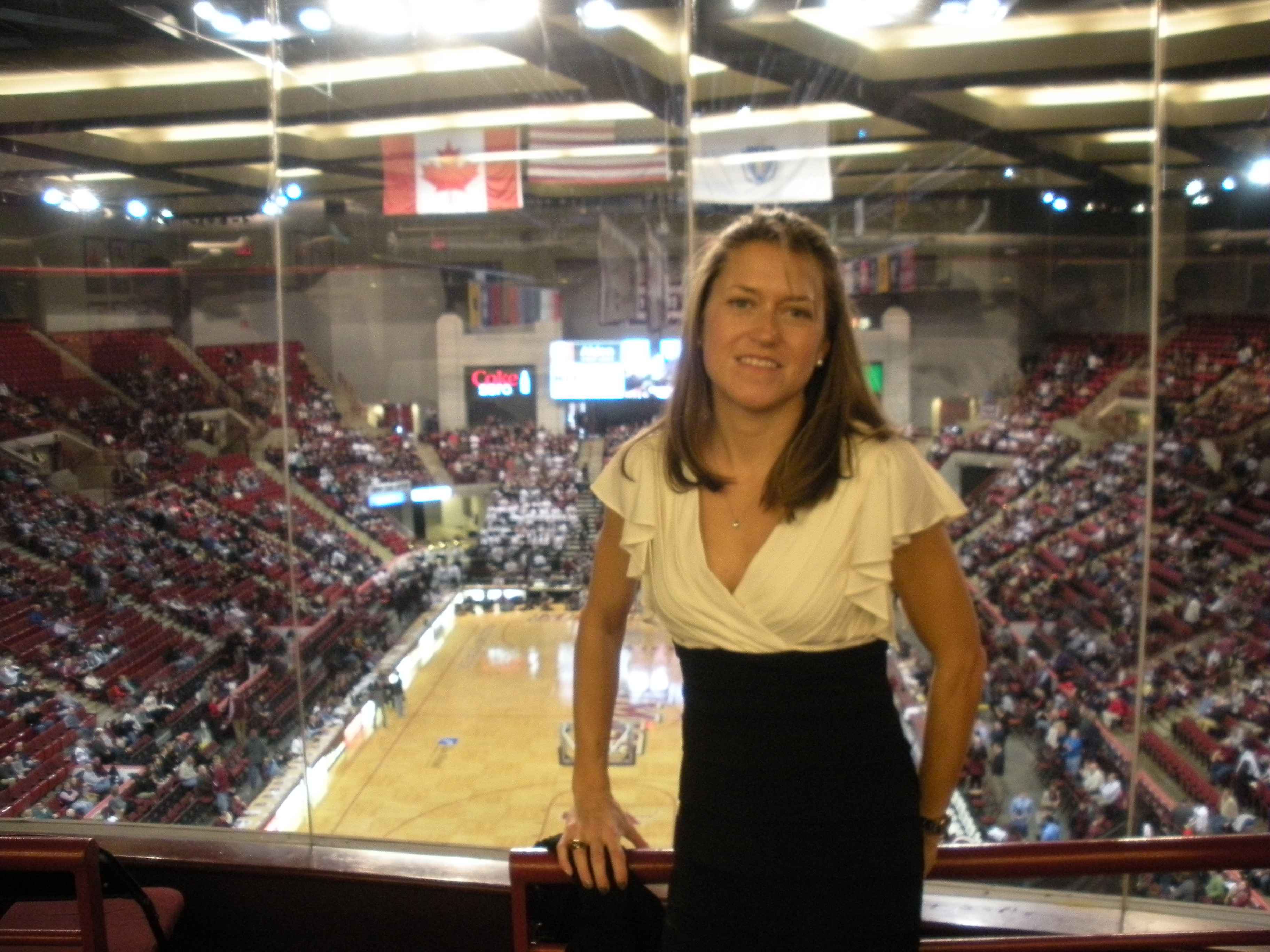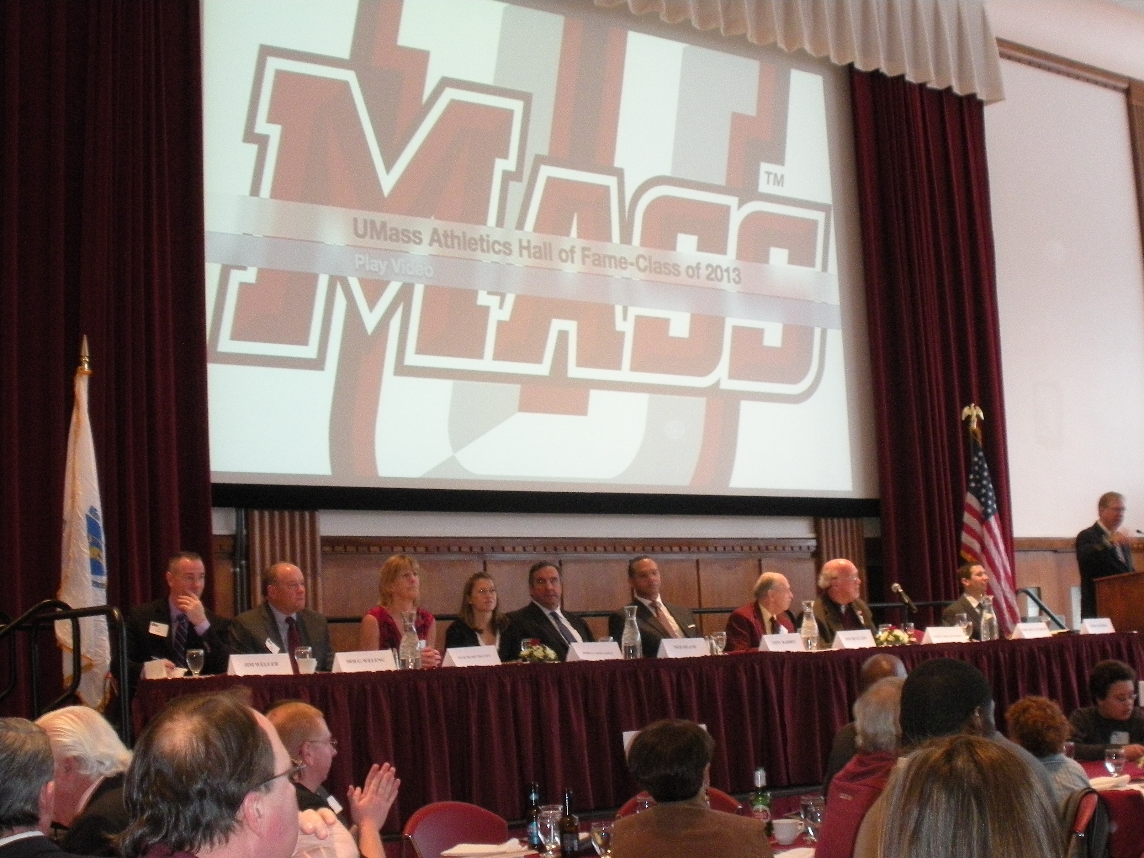 I was notified of the honor in October so I’ve been counting down the days and waiting in anticipation since then. The whole day Sunday was pretty incredible. It started with a men’s basketball pre-game reception in The Massachusetts Room at the Mullins Center. The walls were covered with beautiful plaques of all the hall of fame members throughout UMass history. I was really taken by the older plaques which were done by a commissioned artist whose work was beautiful. If UMass ever decides to go back to the old format I would love to get in line for that job! At the reception we met the other five inductees for this class and a lot of the alumni club members that were there to watch the game. We also finally met Jason Germain. Jason organized the event and has been in touch with all of the inductees, via phone and other social media, about preparing for the event since October, thanks Jason! After all of that, we went down to our seats for the game against Fordham. We had floor seats which was super cool to be so up close to the players and all the action. At half time they called us out to the court to be recognized. I have to be honest that it was hard not to feel a tiny bit like a rock star at that moment. UMass dominated Fordham and showed they are a top 25 team. What a game!