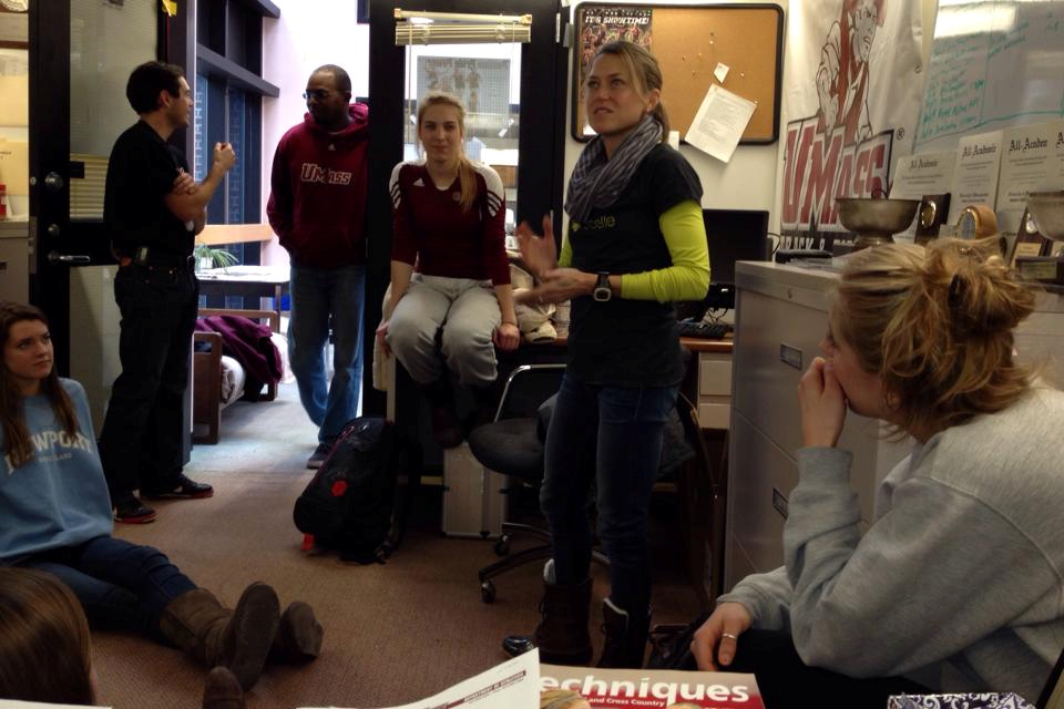 After the game we made our way up to the campus center and student union to get ready for the banquet and induction ceremony. I haven’t been back to UMass in about ten years so walking through campus and seeing all the changes and things that are still the same was a total trip. I was excited with everything I saw. At the campus center we met up with my family, my UMass teammates, and coach Julie LaFreniere. Catching up with Julie and my old teammates meant so, so much to me. Since moving to Pennsylvania ten years ago it’s been really hard for me to stay connected. If I’m home visiting my parents I’m usually trying to juggle my training with recovering from the travel or a race in New England that I might be there for. Sadly, visiting my friends always seems to get pushed back. Luckily we all went out after the banquet and spent some more time together. It was so much fun to be with them, catching up and telling stories about our days at good old UMass. I felt a little sad afterwards because I miss them dearly.
