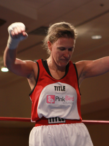 An incredible “Thank You” goes out to the woman with more contained energy than a powder keg with a lit fuse, Terri “The Boss” Moss, who organized and put on this phenomenal event, shuttled me around Atlanta, fed me pancakes, coached fighters, and probably wrestled alligators afterward in order to relax a bit. She also rightly chastized me for the right hooks — which are not for beginners — that I threw during my fight, which Bonnie will also do later. I’m also grateful to Xavier “Bad Pads” Biggs for his quiet, effective cornering, to first-time fighter and Biggs’ Blue Corner woman Laura Messier, who also went out of her way to become a friend to me, and to women’s boxing publicist Amy Green, who texted my win to my coach for me, got one of my all-time boxing heroes Chevelle Hallback on the phone to congratulate me on my win, and who tactfully will not tell anyone how ridiculous I got over celebratory Pina Coladas at Trader Vic’s in downtown Atlanta the night after. And of course, my trainer Bonnie Mann, who inspired all this craziness in the first place.