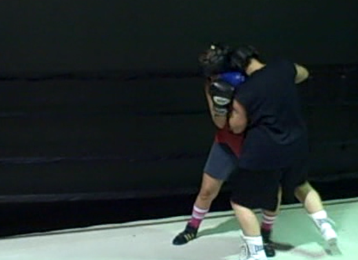 With such constant engagement, we found ourselves in a frequent clinch — a situation I hate with a passion but can’t avoid. I hate it because I can feel Bonnie’s uppercut wanting to destroy me from underneath, I feel her incredible power trying to shove me out of the ring, I know she’s going to demolish me on the exit with a bomb hook to my ear.