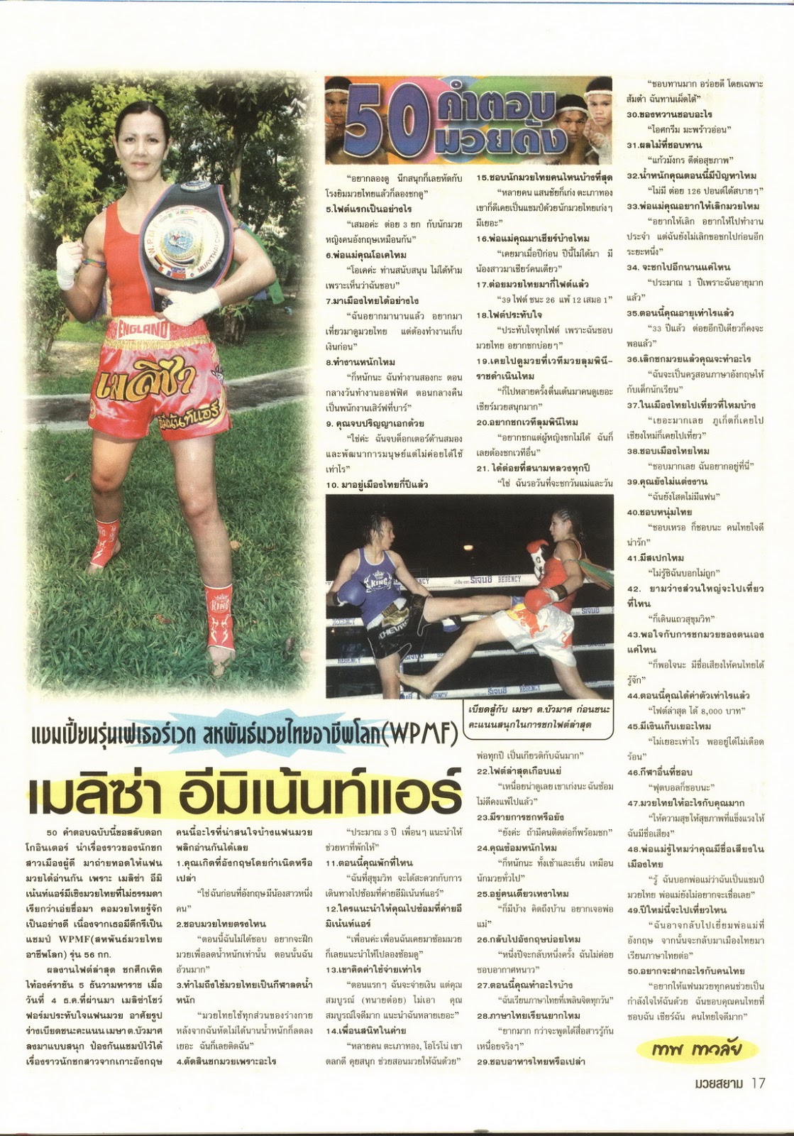 Melissa in MuaySiam magazineBut in the last few months, retirement has been on your mind, what brought about the change in attitude? I suppose my main consideration was money and a career. I’m 34 next month and there’s only so long you can dedicate so much time to what is essentially a hobby. It is hard to combine training and work, especially in Thailand due to the long training hours, which are also during normal office hours since the gyms are mainly catering for professional fighters. Particularly within the last year I have found the training much tougher on the body, with injuries becoming more frequent.I think as you age you can still handle the hard training sessions but rest and recovery become increasingly important and it can be hard to factor in time for that. The other change I’ve noticed as I’ve got older is the weight is much harder to keep off – for me it does unfortunately seem to be true about the metabolism slowing in the thirties!