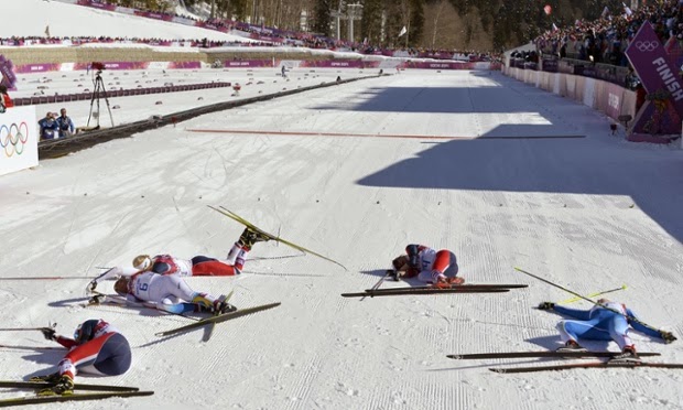 The women's cross-country skiathlon finish line. Photograph: Odd Andersen/AFP/Getty ImagesWhen I saw this photograph at first on The Guardian website, I thought there had been a terrible tragedy. But no, it's just the aftermath of the Cross-country skiathlon.